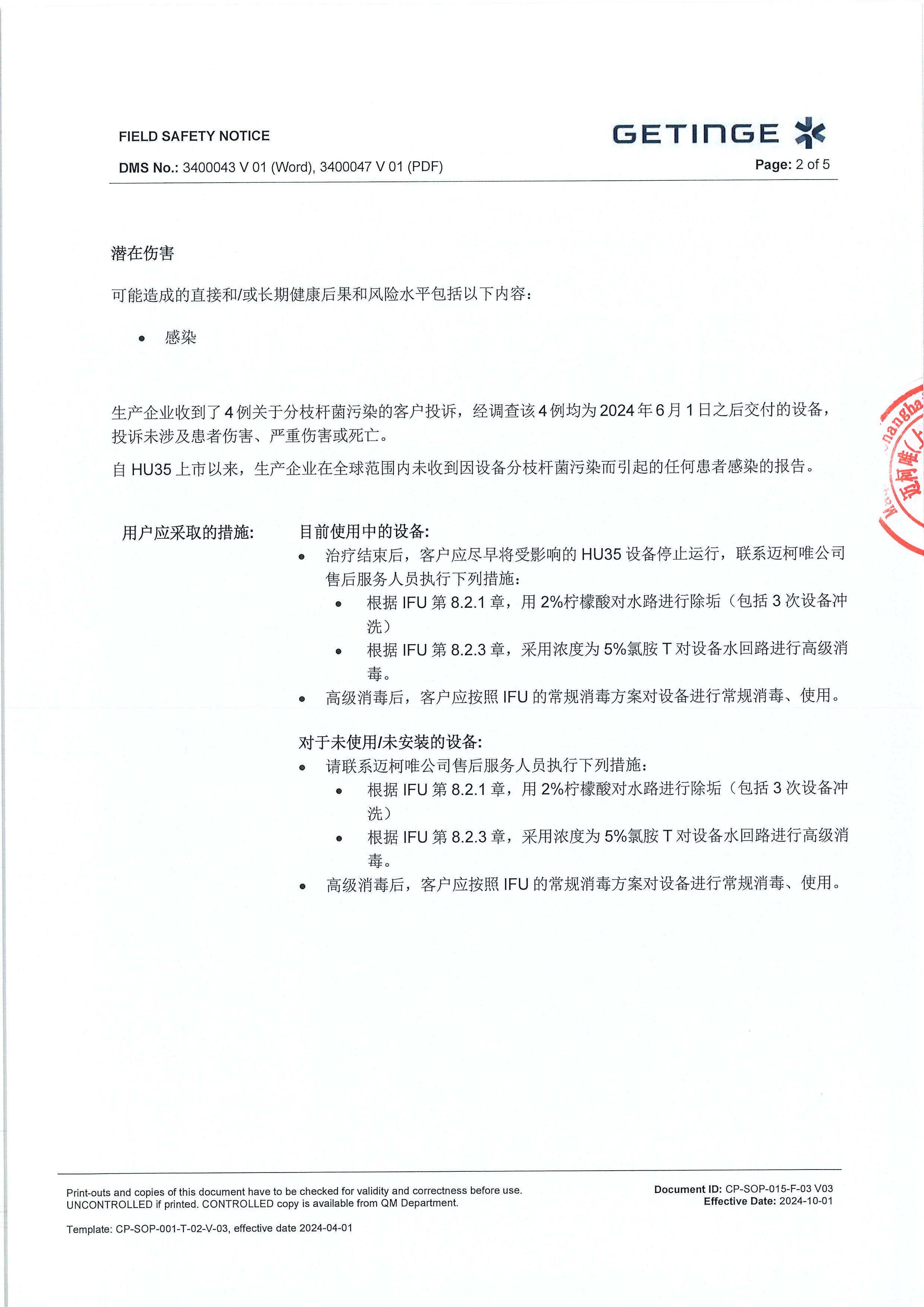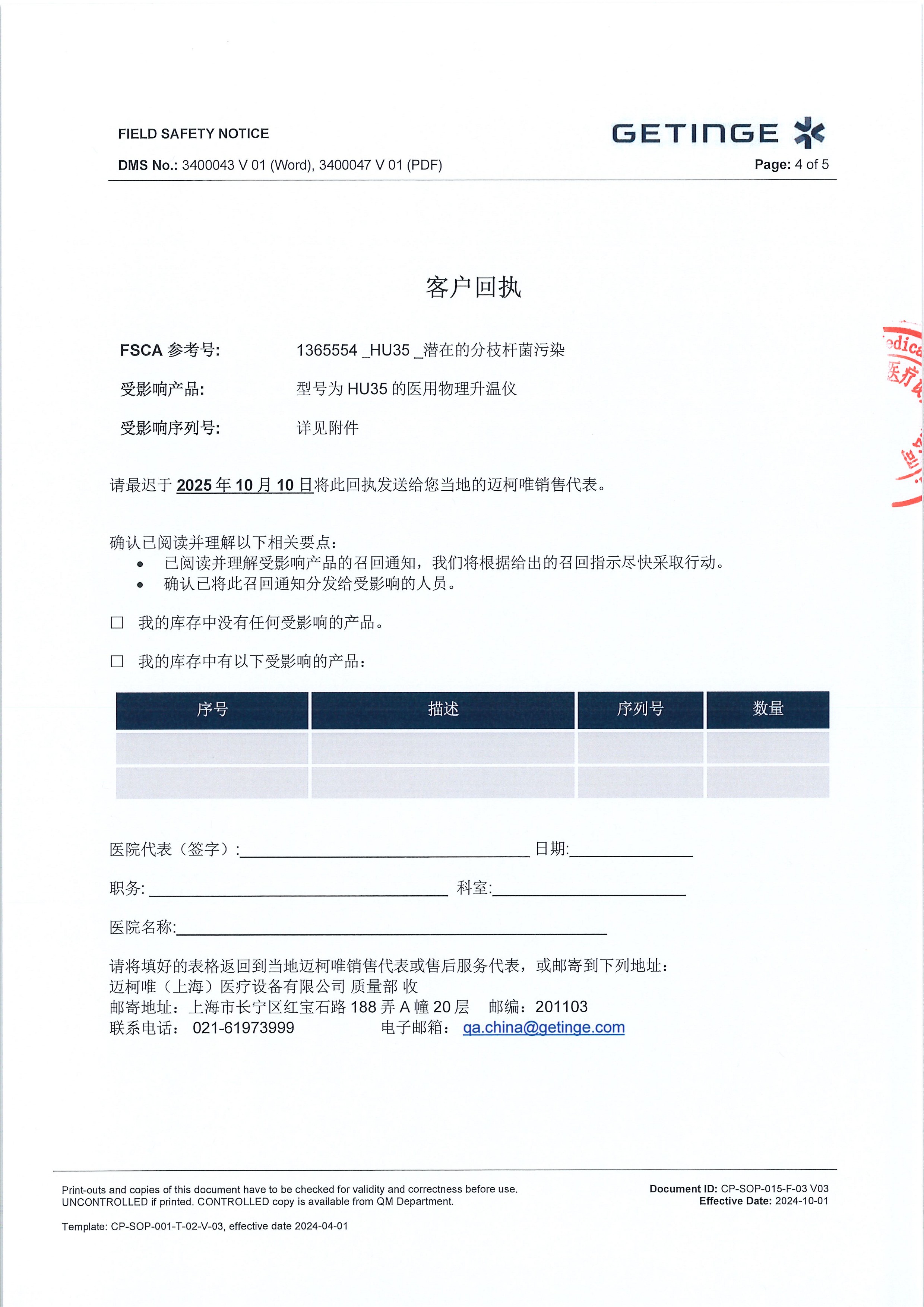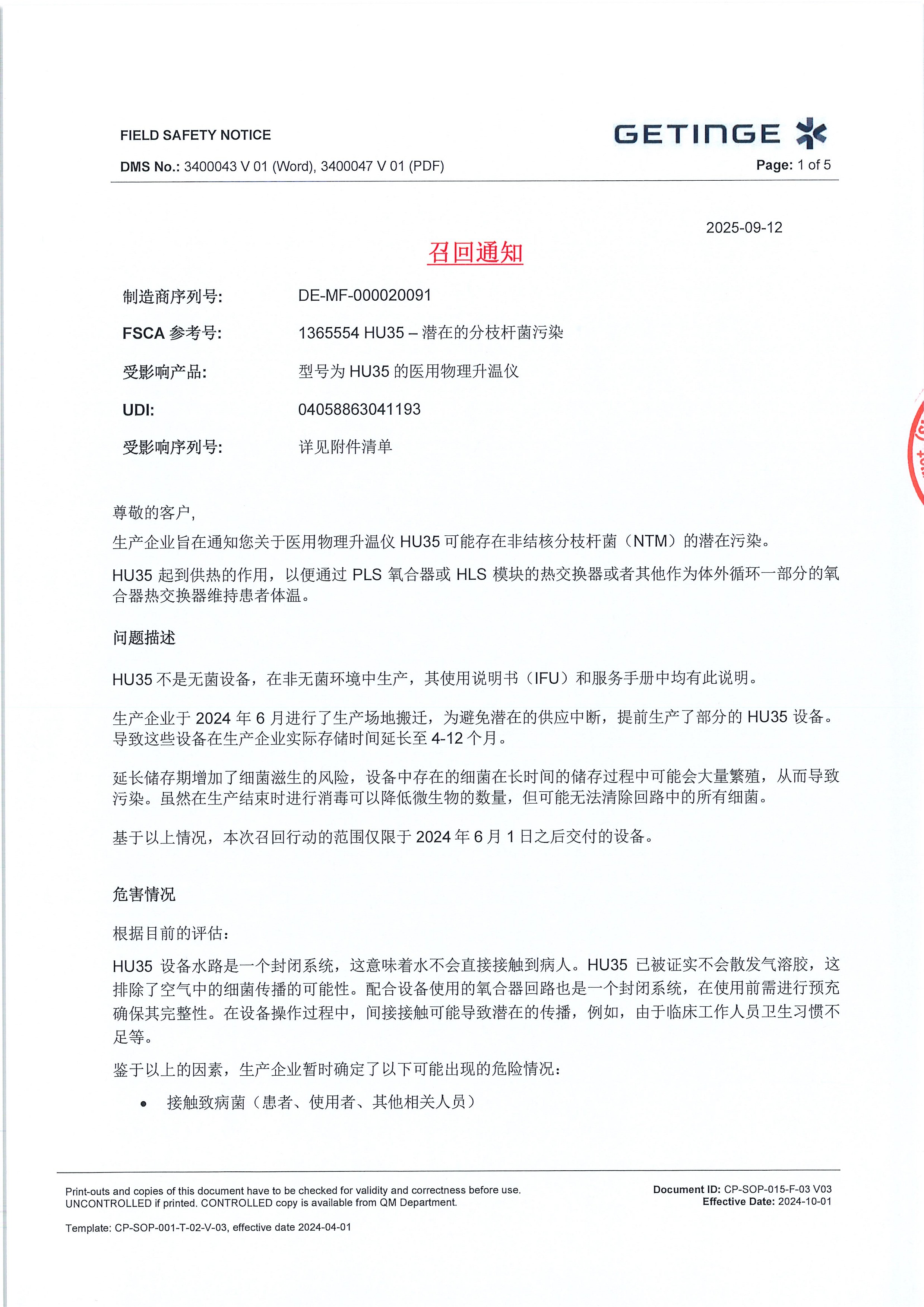 本着对客户负责,确保产品使用安全、有效,经生产企业评估后决定对其生产的医用物理升温仪Heater Unit HU35(注册证号:国械注进20162101786)主动召回。召回级别为二级。