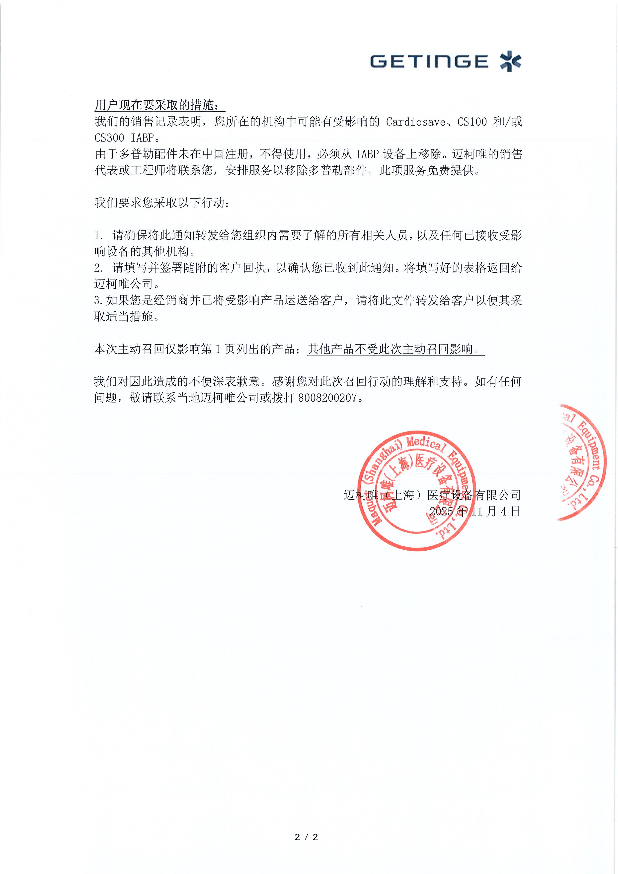 本着对客户负责的态度,确保产品使用安全、有效,经生产企业评估后决定对其生产的主动脉内球囊反搏泵CARDIOSAVE Hybrid【注册证号:国械注进20193082223(国食药监械(进)字2014第3214542号)】、CS100【注册证号:国械注进20143085339(国食药监械(进)字2010第3213339号;国械注进20143215339)】、CS300【注册证号:国械注进20143085338(国食药监械(进)字2010第3213356号;国械注进20143215338)】进行主动召回。